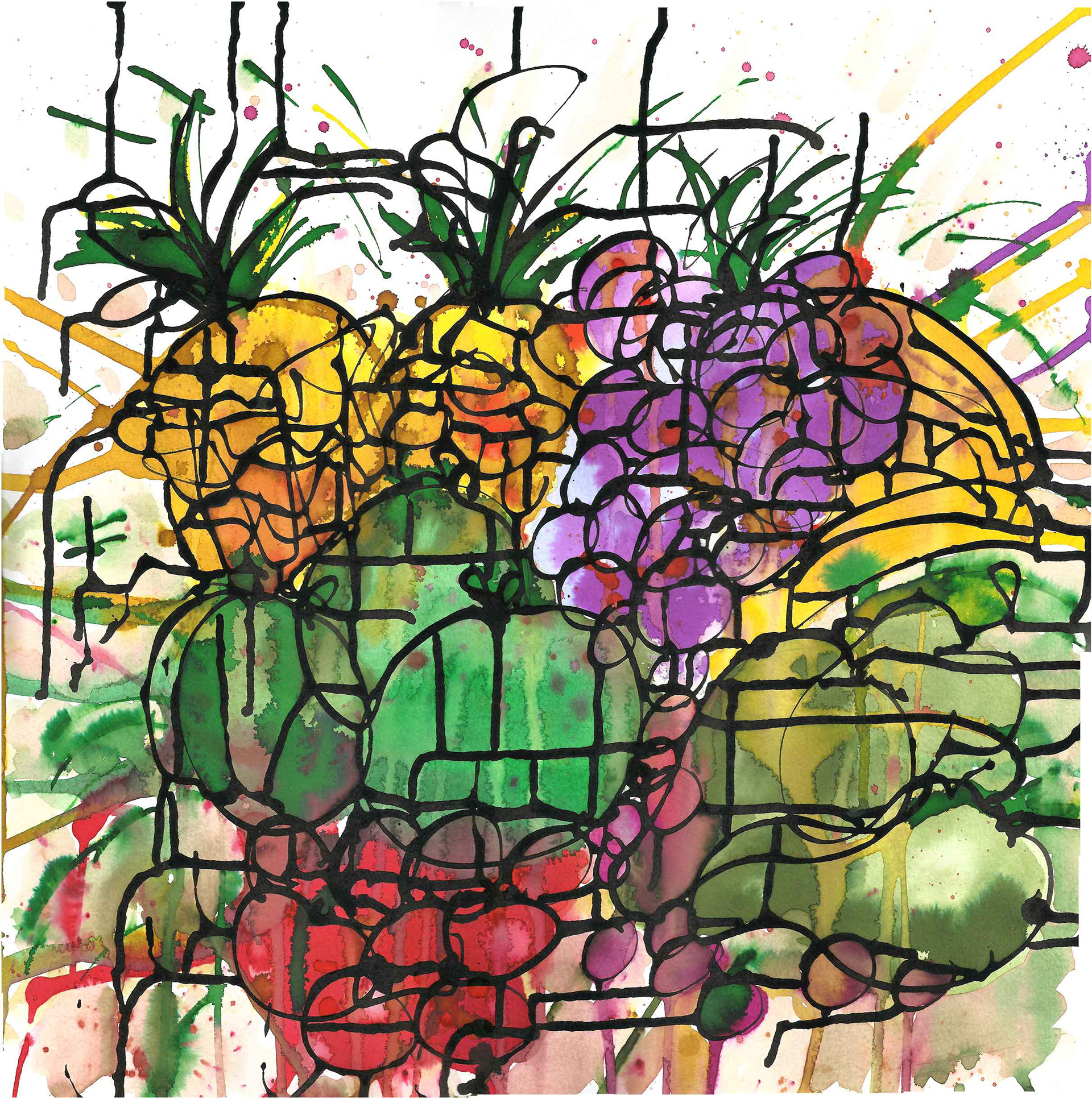 Piñas, uvas, bananos, manzanas, peras y cerezas.
