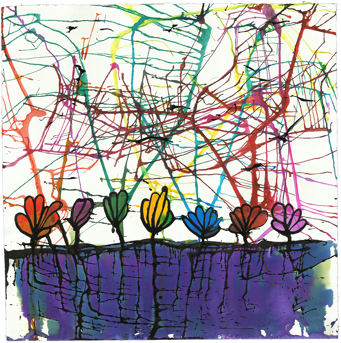 Siete flores en tierra morada. (50 x 50)
